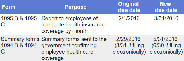 As noted by this tax professional, a crucial driver to being in full compliance with the ACA is timely reporting of requisite 1095B and 1095C information to affected employees. Special note should be made to the fact that the IRS has granted an extension for Form 1095 B and 1095 C being sent to employees. The following table summarizes the impact of the statutory extension of time to report to employees.